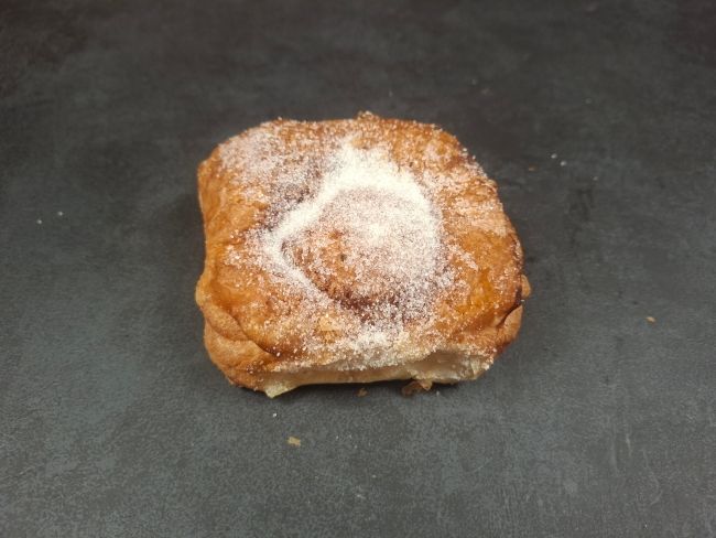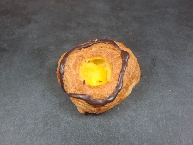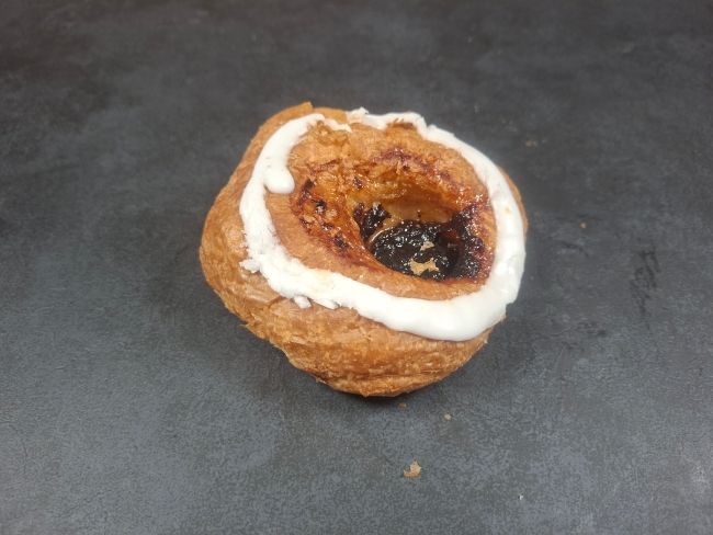 Fastelavnsbolle af wienerdej med fyld af creme og pyntet med glasur