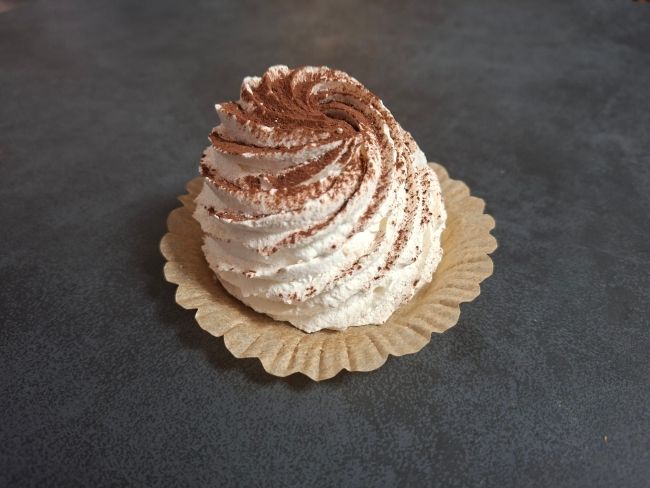 Marengskube fyldt med flødefyld og hakket chokoladestykker