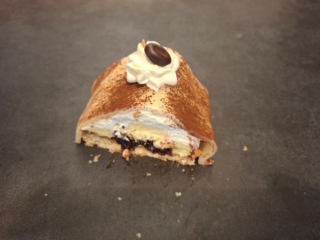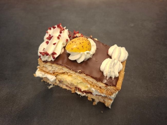 Flødekage med to lag butterdej, med lækker kagecreme, flødeskum og marmelade - afsluttet med glasur og flødeskum på toppen