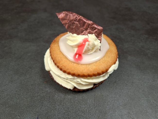 Walesstang med creme og hindbærmarmelade - pyntet med flødeskum